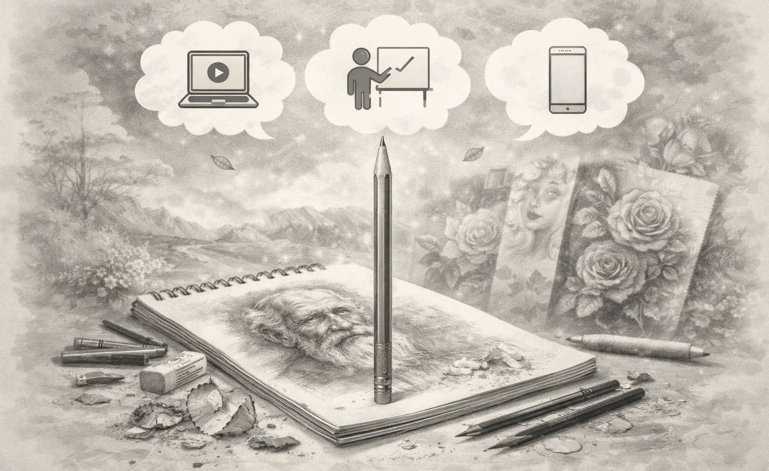 شناخت ابزارها (مداد طراحی، زغال، کنته، پاککن خمیری)